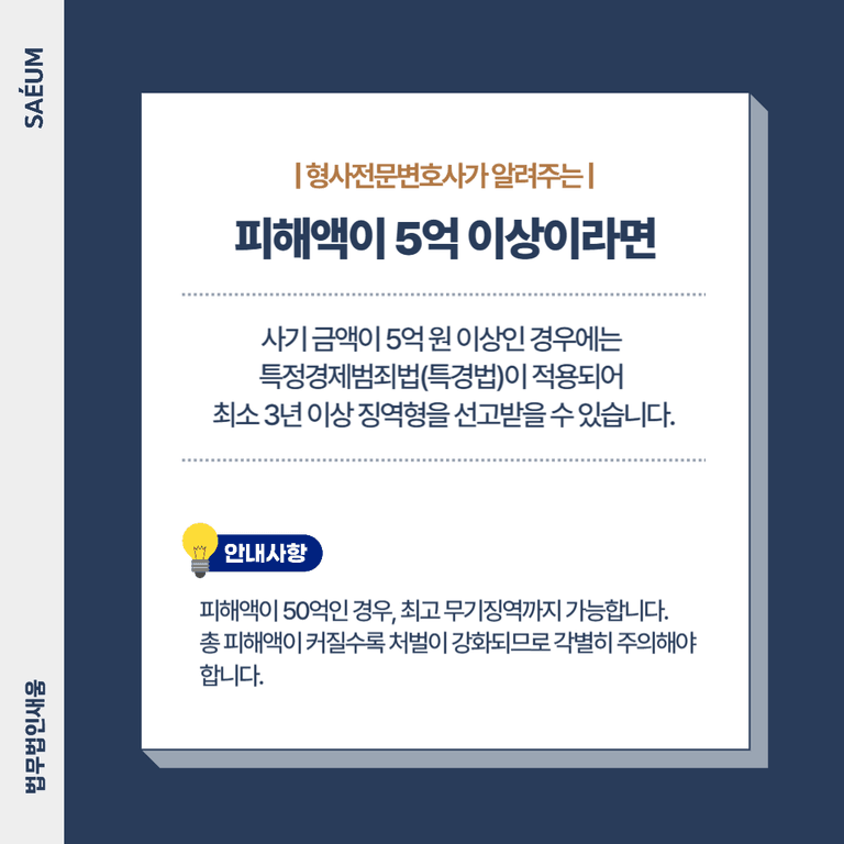 또한, 사기 금액이 5억 원 이상인 경우에는 특정경제범죄법(특경법)이 적용되어 최소 3년 이상의 징역형을 선고받을 수 있습니다. 피해액이 커질수록 처벌이 강화되므로 각별히 주의해야 합니다.