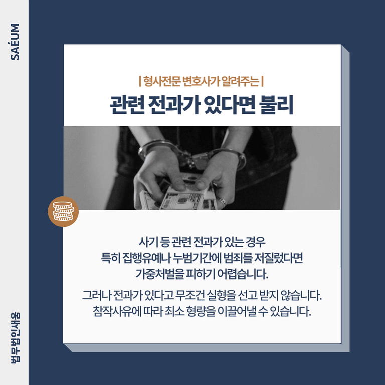 그러나 전과가 있다고 해서 무조건 실형을 선고받는 것은 아닙니다. 전과가 있더라도, 처벌을 받기 어려운 정도의 참작사유나 죄질이 비교적 가벼운 경우에는 선처가 가능할 수 있습니다. 긍정적인 참작사유를 준비하여 최소한의 형량을 이끌어낼 수 있도록 하는 전략이 중요합니다. 따라서 전과가 있는 상태에서 연루된 경우, 적극적으로 대응하고 참작사유를 잘 준비해야 합니다.