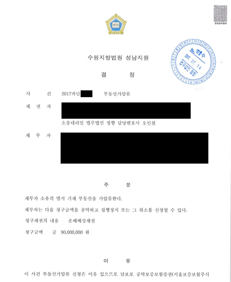 일식당을 권리금을 받고 양도하였음에도 불구하고 반경 약 10km 내에 동일한 식당을 개업한 자를 상대로 한 부동산 가압류신청을 진행하였습니다. 동일한 식당을 개업한 자는 제3자(지인)의 명의로 사업자등록을 하는 등 교묘하게 법령상의 제한을 피하고자 했지만, 오인철 변호사는 실질적인 식당 운영자가 양도인이라는 점을 부각하여, 결국 기존 식당 양도인이 소유하고 있는 부동산(아파트)에 대한 가압류를 인용받았습니다.