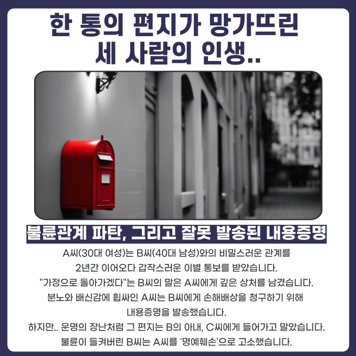 만약 A씨가 C씨를 직접 찾아가 불륜 사실을 말하거나, 메시지·사진 등 증거를 직접 전달했더라면 이야기는 달라졌을 수 있습니다.