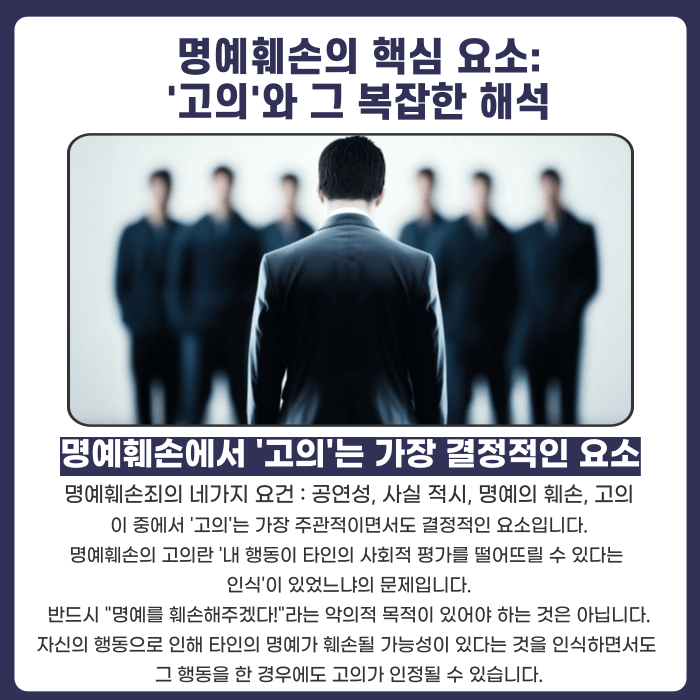 이 중 ‘고의’는 특히 중요합니다. 반드시 상대방을 망신 주기 위해 작정한 경우만을 말하는 것이 아니라,