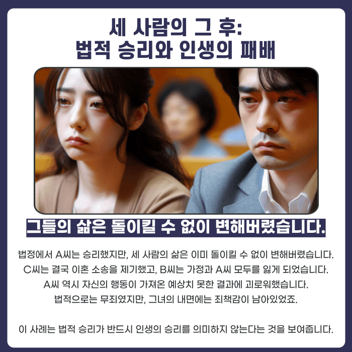 결국 A씨는 법적으로는 이겼지만, 그로 인해 세 사람의 삶은 모두 달라졌습니다.