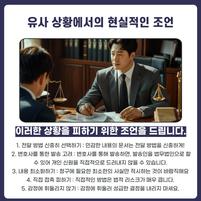 – 증거를 직접 보내는 건 고의로 인정될 위험이 매우 큽니다.감정에 휘둘리지 않기