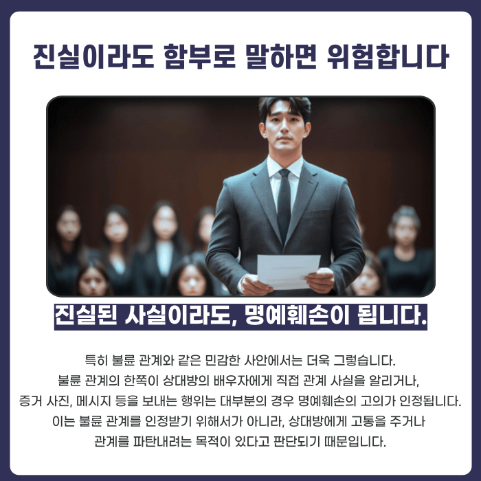 특히 불륜 등 민감한 내용을 제3자에게 알릴 경우, 그 목적이 복수나 고통을 주기 위한 것이라면 처벌받을 수 있습니다.