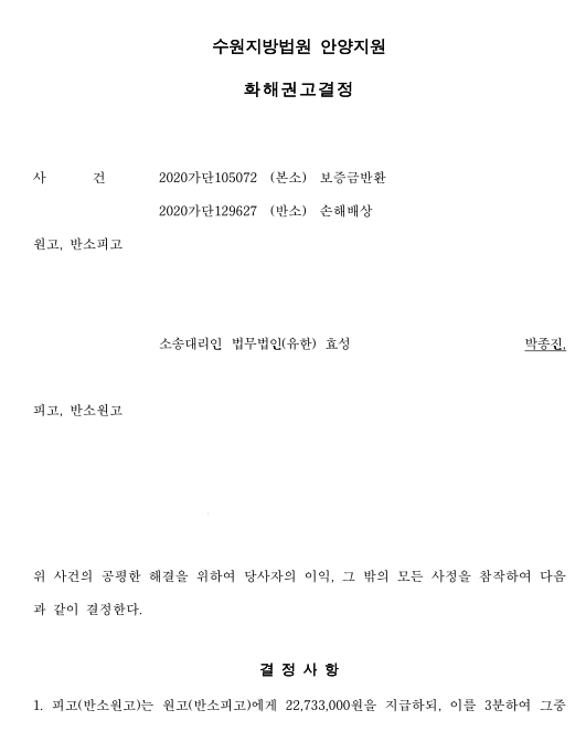 결국, 임차인은 임대인에게 보증금 반환을 청구하는 소송을 제기하였고, 임대인은 임차인에게 원상회복비용을 청구하는 반소를 제기하였습니다.