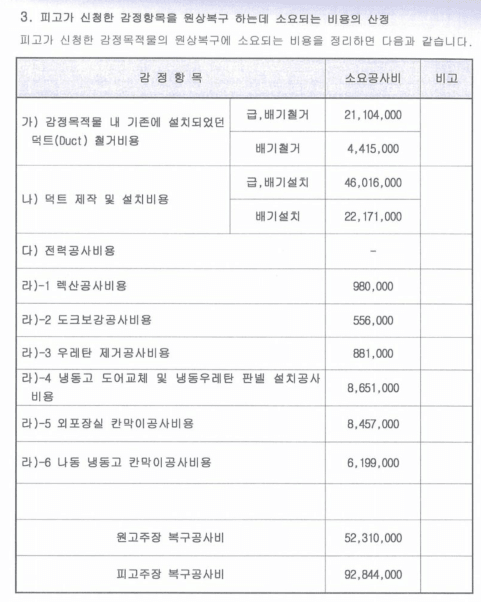 2. 임대인이 신청한 감정 결과 임대인이 주장하는 복구공사를 위해서는 92,844,000원이 필요하다는 감정 결과가 나왔습니다.
