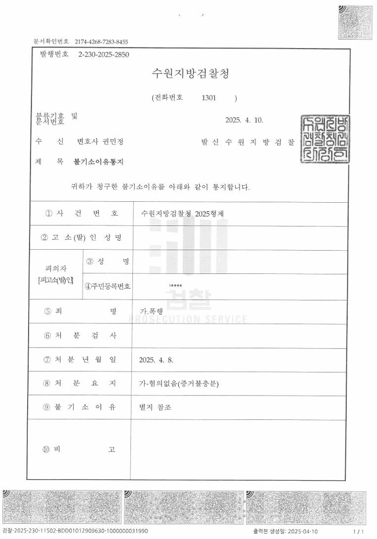 그 결과 담당 검사는 해당 피의자에게 혐의없음 불기소처분을 내렸습니다.