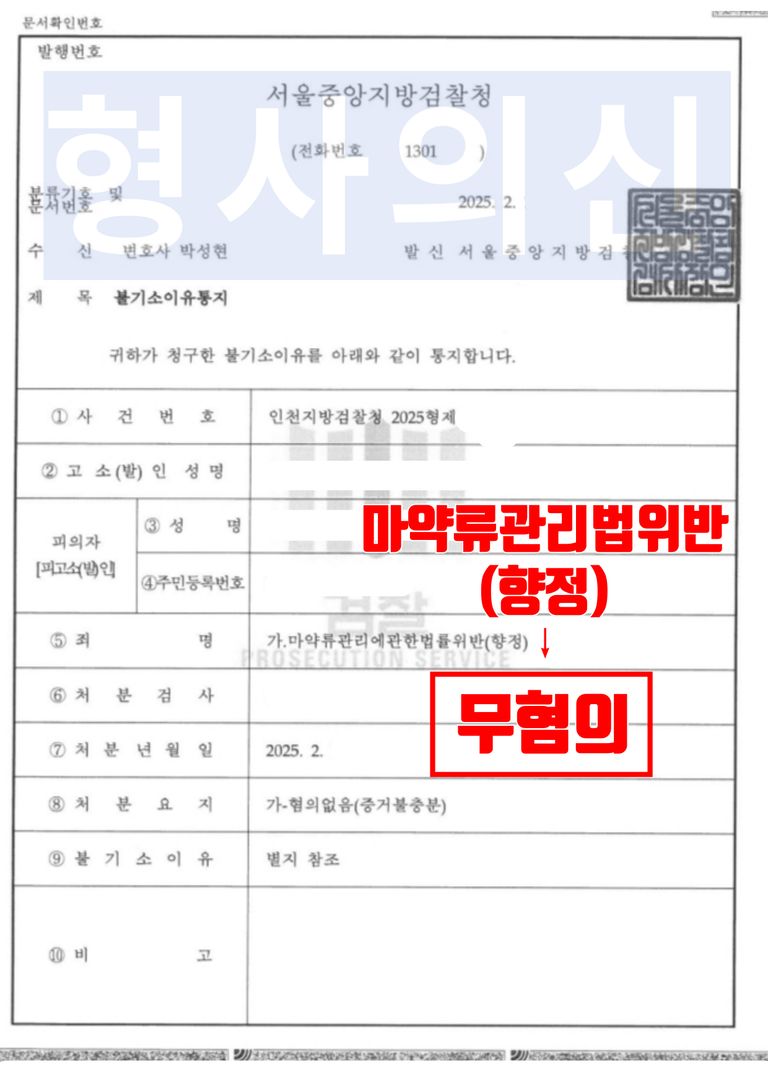 인천지방검찰청 검사는 법률사무소 유(唯)의 형사전문변호사가 제출한 변호인의견서 및 경찰조사 때 진술한 취지를 받아들여, 인터넷 사이트에서 추천하는 상품이 정상적으로 판매되는 물품으로 문제가 없을 것으로 생각했다고 진술한 점, 의뢰인이 마약성분이 있다는 것을 인식하고 고의로 주문한 것이 아닌 점 등을 이유로‘불기소(혐의없음)’결정을 하였습니다.