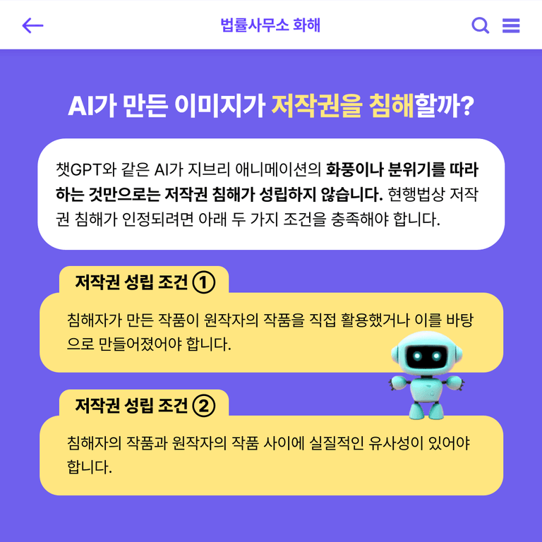 챗GPT와 같은 AI가 지브리 애니메이션의 화풍이나 분위기를 따라 하는 것만으로는 저작권 침해가 성립하지 않습니다. 현행법상 저작권 침해가 인정되려면 두 가지 조건을 충족해야 하는데요.