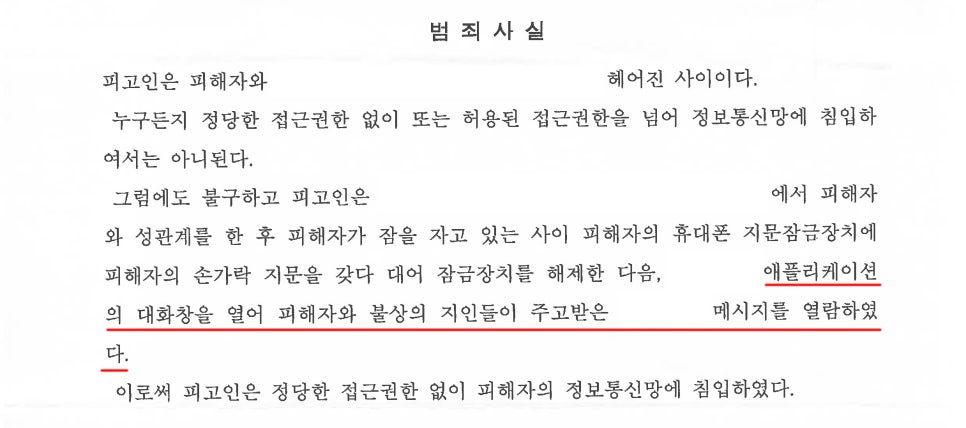 그러던 어느 날 A씨는 B양과 함께 성관계를 한 뒤, B양이 잠들어 있을 때 B양의 남자관계 등이 궁금하여 B양의 휴대전화에 B양의 지문을 갖다 대어 휴대전화 잠금장치를 해제한 다음 B양이 애플리케이션을 통해 다른 남자들과 주고받는 메시지를 보게 되었습니다.