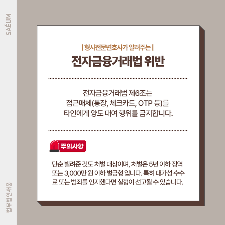 전자금융거래법 제6조는 접근매체(통장, 체크카드, OTP 등)를 타인에게 양도하거나 대여하는 행위를 엄격히 금지합니다. 단순히 ‘빌려준 것’이어도 처벌 대상이며, 처벌 수위는 5년 이하 징역 또는 3,000만 원 이하 벌금형입니다. 특히 대가성 수수료가 오갔거나, 범죄 사용을 인지한 정황이 있다면 실형이 선고될 수 있습니다.