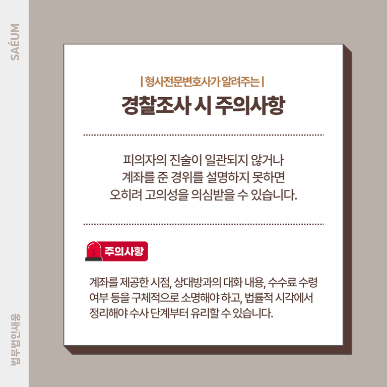 또한, 피의자의 진술이 오락가락하거나, 계좌를 준 경위를 명확히 설명하지 못하면 오히려 고의성을 의심받을 수 있습니다. 계좌를 제공한 시점, 상대방과의 대화 내용, 수수료 수령 여부 등을 구체적으로 소명해야 하며, 이 모든 과정을 법률적 시각에서 정리해야 수사 단계부터 유리한 입장을 취할 수 있습니다.
