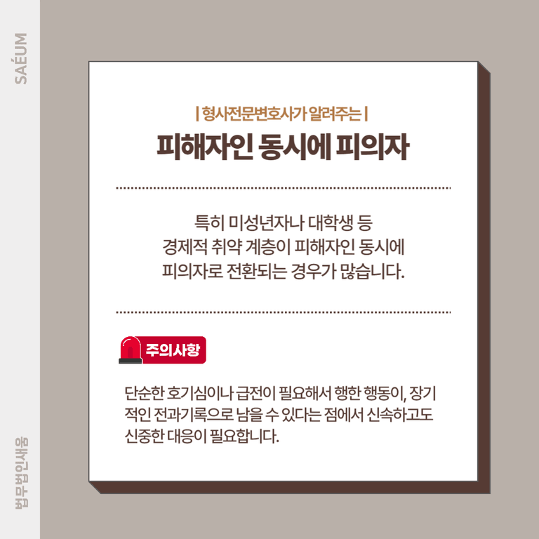 특히 미성년자나 대학생, 경제적 취약 계층이 피해자인 동시에 피의자로 전환되는 사례가 빈번하게 발생합니다. 단순한 호기심이나 급전이 필요해서 행한 행동이, 장기적인 전과기록으로 남을 수 있다는 점에서 신속하고도 신중한 대응이 필요합니다.