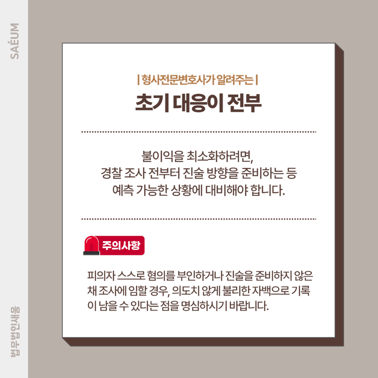 피의자 스스로 혐의를 부인하거나 진술을 준비하지 않은 채 조사에 임할 경우, 의도치 않게 불리한 자백으로 기록이 남을 수 있다는 점을 명심하시기 바랍니다. 빠르게 법률 조력을 받는 것, 그것이 억울한 처벌을 피할 수 있는 유일한 방법입니다.