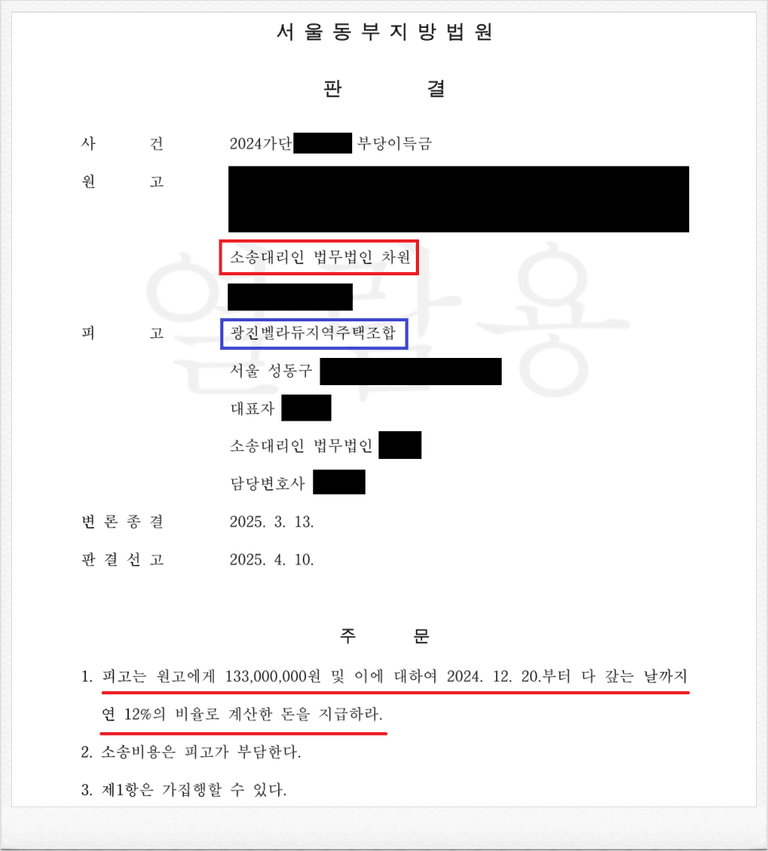 저는 광진벨라듀지역주택조합을 상대로 한 다수의 분담금 반환 소송에서 승소 판결은 물론, 실제 납입금 환불까지 성공적으로 이끌어낸 사례들을 다수 보유하고 있습니다.