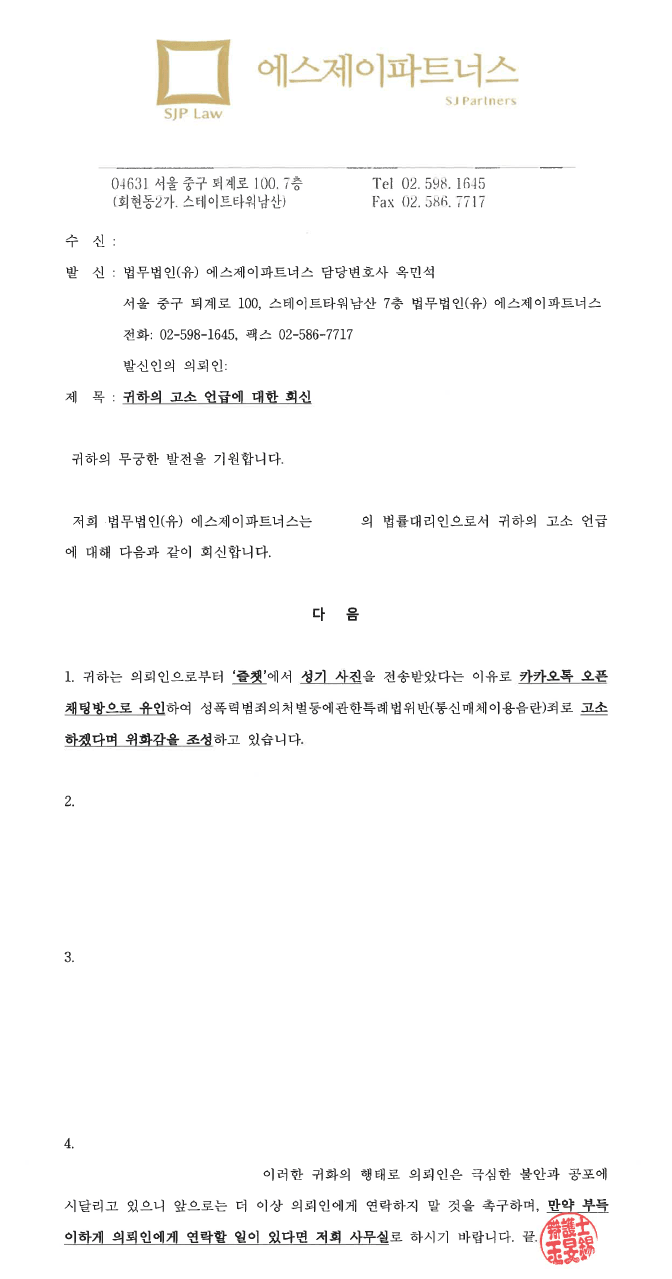 이어서 저는 사실관계와 법리판단을 명확히 정리하는 한편 고소할 경우의 불이익을 언급하고 앞으로는 모든 연락을 저에게 오게끔 하는 내용의 내용증명을 작성하여 B씨에게 전달하였습니다.