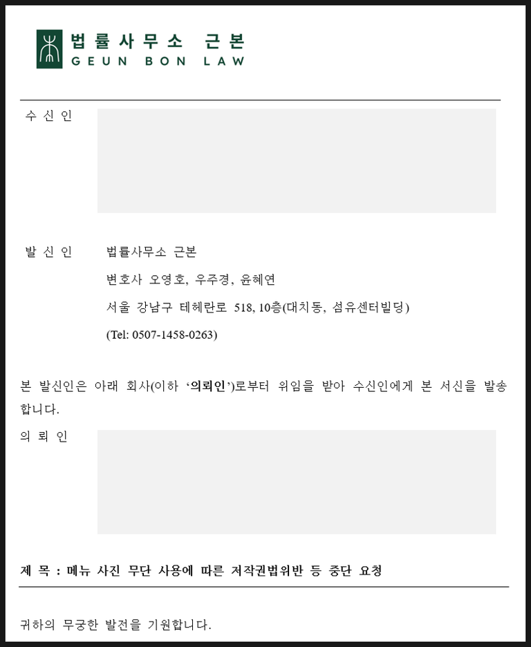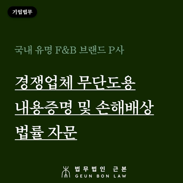 국내 유명 F&B 브랜드 P사 : 경쟁업체 무단도용 내용증명 발송 및 손해배상 법률 자문