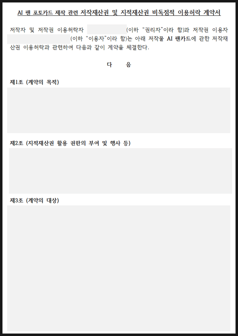 AI 팬 포토카드 제작 과정에서 활용되는 1차 저작물 및 2차 저작물의 범위를 명확히 하여 향후 분쟁 가능성을 최소화했습니다.