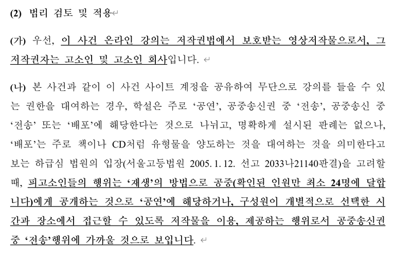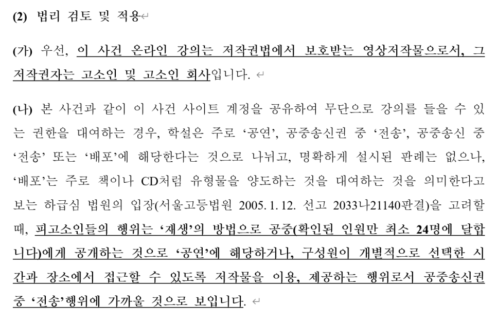 상대방들이 인강 계정을 공유하여 무단으로 강의를 들을 수 있는 권한을 대여하는 경우는 위 '공연' 내지 '전송'에 해당하는 것으로 볼 수 있습니다.
