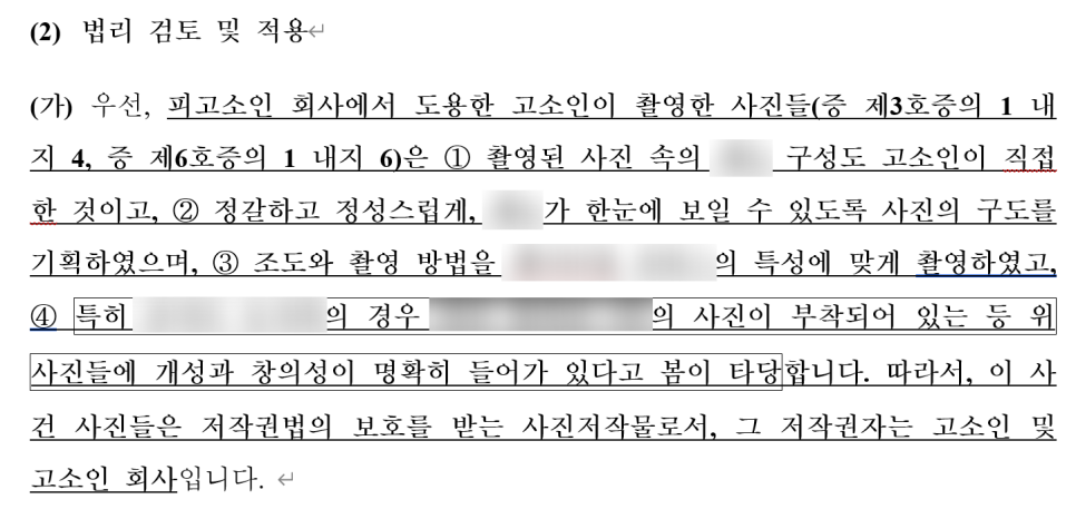 따라서 위 대법원 법리에 맞춰 문제의 사진이 개성과 창조성이 있는 저작물이라는 점을 최대한 주장해야 합니다. 저희는 상품사진의 구성, 구도, 조도와 촬영방법 등을 봤을 때 명확한 기획 하에 치밀하게 촬영된 것이므로 분명히 저작물에 해당한다는 점을 적극 주장했습니다.