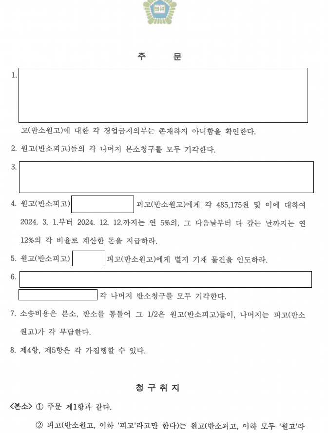 오늘은 제가 가맹본부를 대리했던 사건의 결과를 포스팅을 합니다. 결론적으로 원고들(가맹점)의 청구 대부분이 기각되었고요. 소송 중간에 가맹본부가 제기했던 반소도 대부분 기각되었습니다. 세어보니 주문이 8번까지 있더라고요. 쟁점이 좀 많았던 사건입니다.