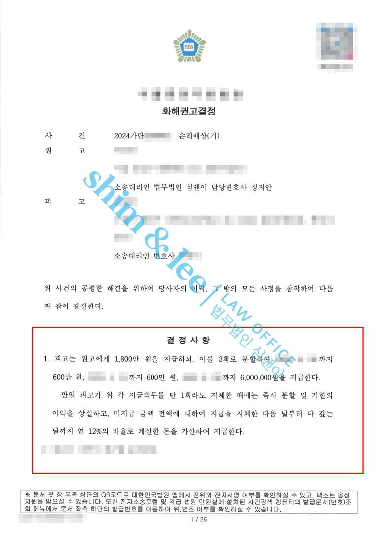 -법원은 화해권고결정을 내렸고, 원고와 피고 모두 이에 동의하면서 결정은 그대로 확정되었습니다. 심앤이가 제출한 증거와 주장에 따라 의뢰인이 입은 정신적·물질적 피해가 인정되었고, 총 1,800만 원의 손해배상금이 인용되었습니다.