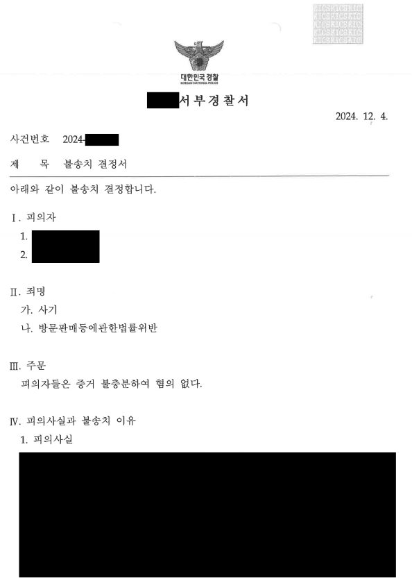 등록의무가 있는 사업자에 해당하지 않는다고 하면서 방문판매등에관한법률위반 혐의에 대하여 불송치(혐의없음) 처분을 하였습니다.