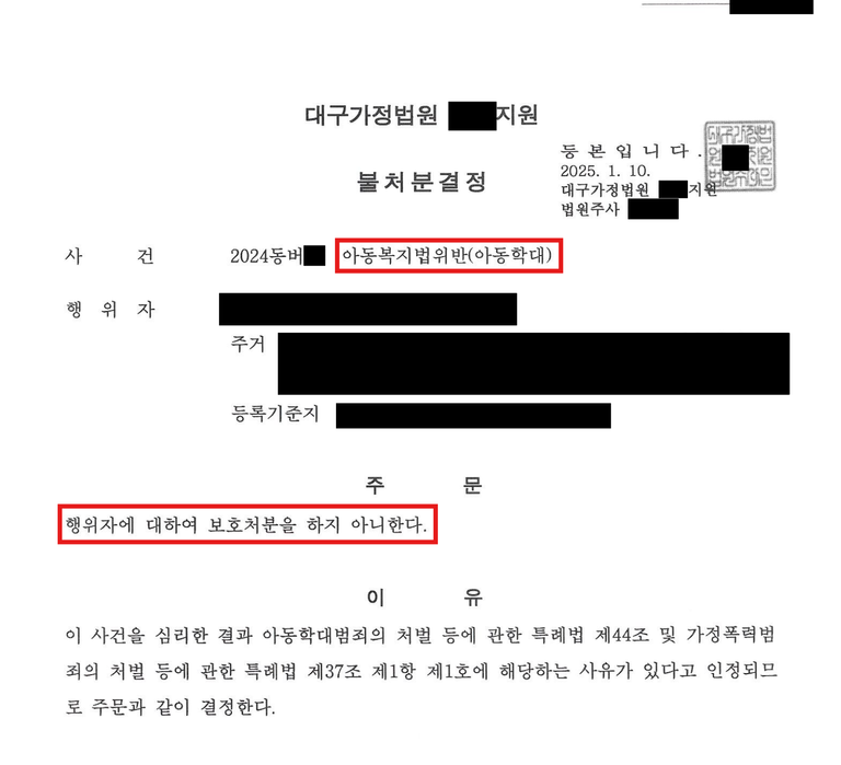 오늘은 아동학대 사건에서 법원으로부터 “불처분”을 받은 성공사례를 소개해드립니다.