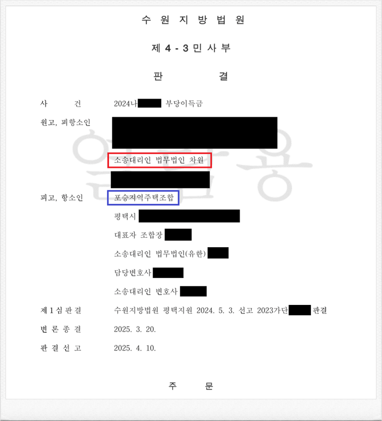 지역주택조합 관련 납입금 반환 소송을 맡기실 경우, 별도의 추가 비용 없이 강제집행까지 전 과정을 책임지고 진행하며, 실제로 납입금을 반환받기 전까지는 성공보수를 청구하지 않습니다.