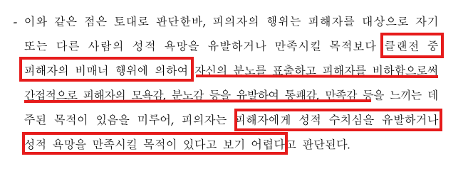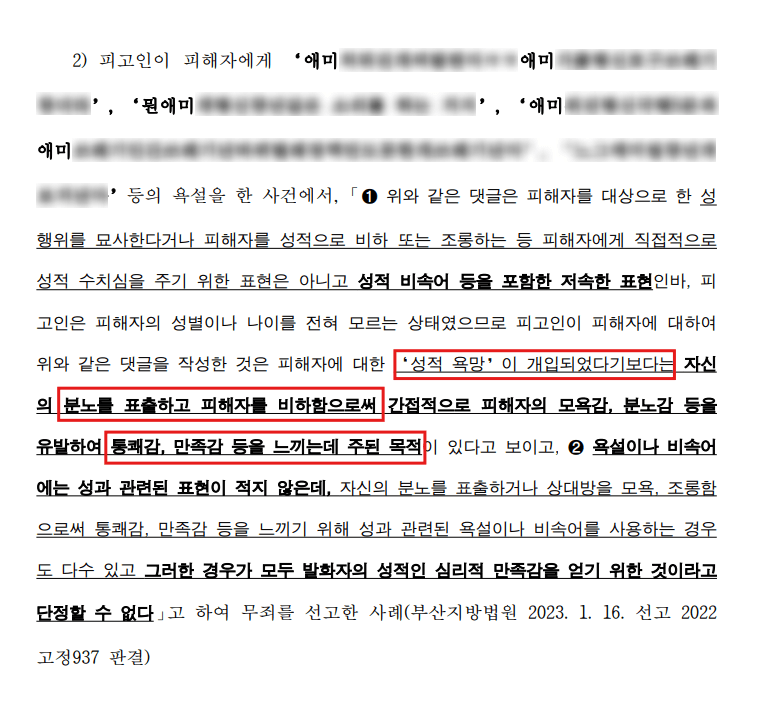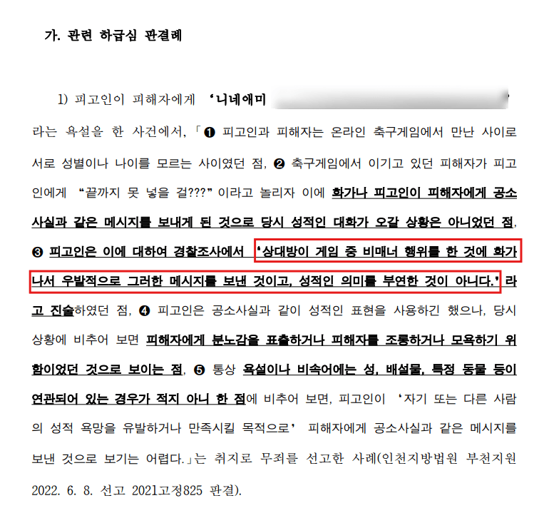 이처럼 당시 의뢰인이 욕설을 하게 된 상황을 살펴보더라도 화가 나서 상대방에게 귓속말로 욕을 하였을 뿐, 의뢰인의 성적 욕망을 유발하거나 만족시킬 목적으로 욕을 한 것이 아니었습니다.