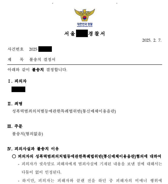 불송치 이유를 보시면, 앞서 본 유사판례의 빨간 박스 안의 문구와 거의 똑같이 판단되었음을 알 수 있습니다.