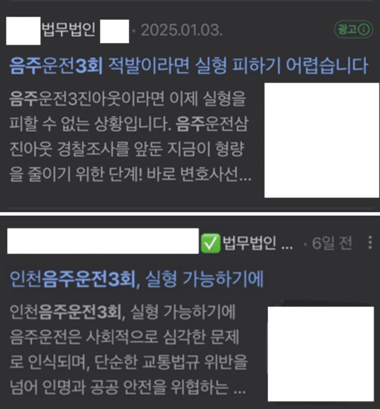 ‘음주운전 3회’라는 키워드로 블로그를 검색해보면, 아래와 같이 집행유예가 어렵다거나 실형의 위험을 강조하는 글들이 많다는 점도 확인이 됩니다.