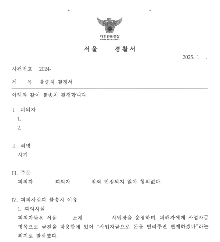 이번 성공사례도 저희 의뢰인이 차용금 사기로 고소당했으나, 경찰 단계에서 불송치(혐의없음) 결정을 받은 사례입니다.