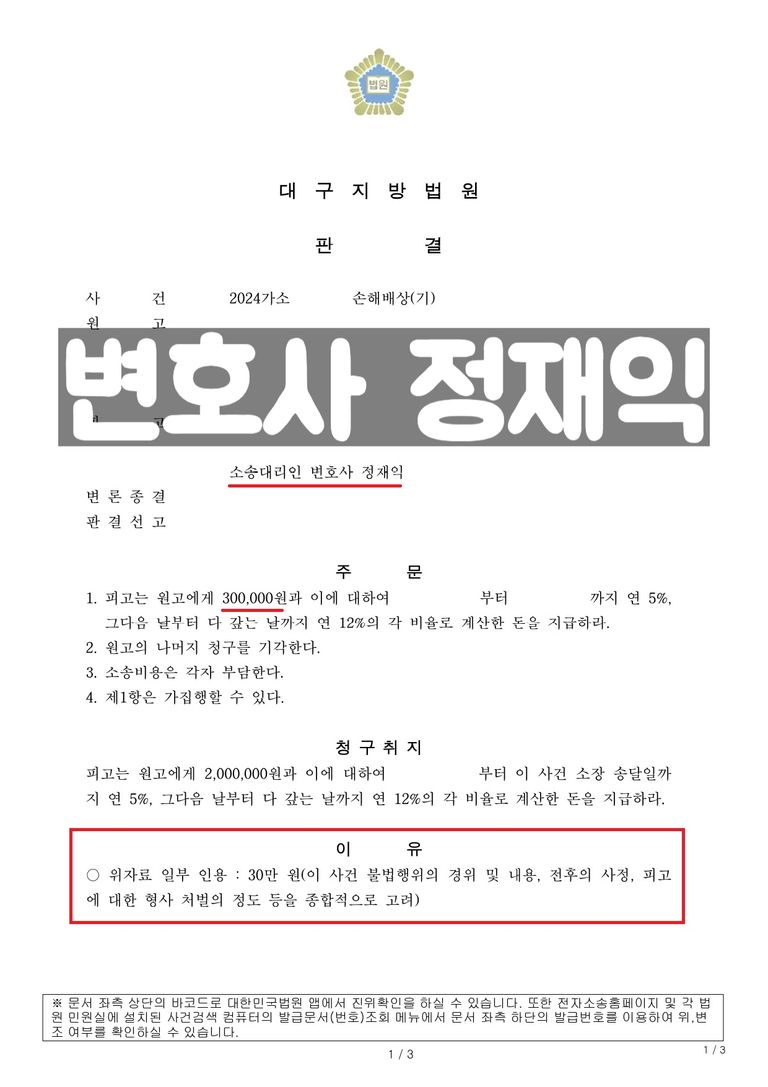 결과 - 상해/명예훼손 무혐의, 손해배상 청구금액 85% 감액