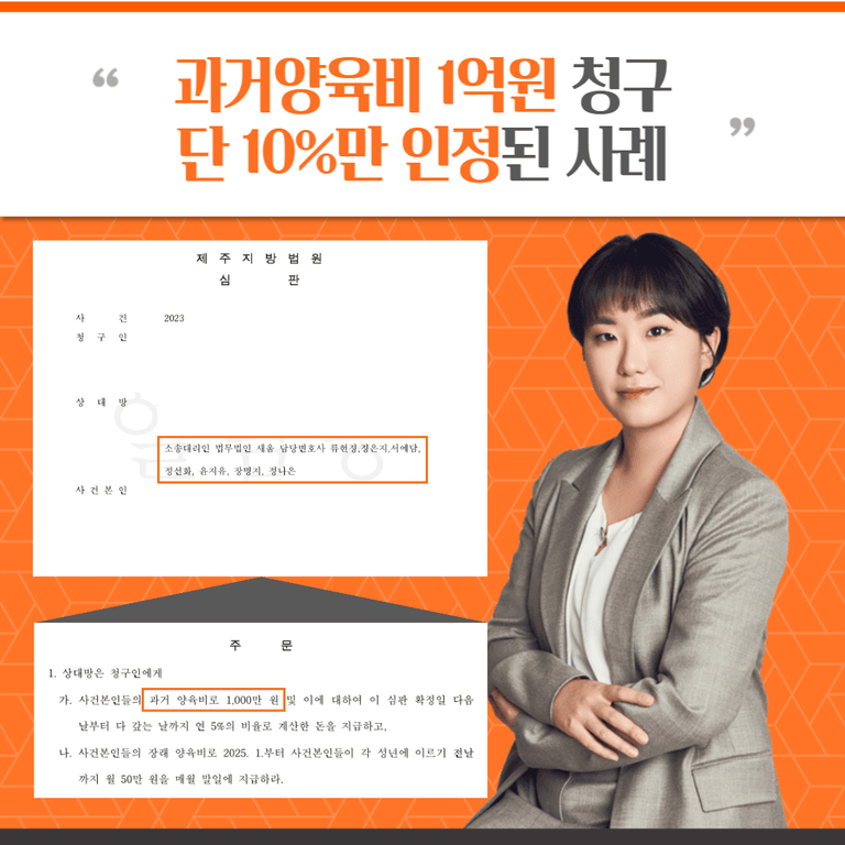 그 결과, 법원은 상대방의 청구액 1억 원 중 단 1,000만 원만을 과거양육비로 인정하였습니다. 이는 실질적으로 소송이 진행된 2년간의 양육비 일부에 해당하는 금액에 불과합니다. 결과적으로 사실상 과거 양육비 전액에 대한 방어에 성공하였습니다.