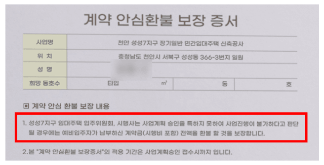 천안 성성 레이크폴리스는 성성7지구 임대주택 입주조합이 추진하는 협동조합형 민간임대아파트로, 충남 천안시 서북구 성성동 일원에 건설될 예정입니다. 이 아파트는 뛰어난 입지를 자랑하며, 10년간 임대 후 저렴한 가격에 분양 받을 수 있다는 홍보로 계약자를 모집하고 있습니다. 계약 당시, 아래와 같은 내용의 <계약 안심환불 보장 증서>를 통해 "성성7지구 임대주택 입주위원회와 시행사는 사업계획 승인을 받지 못한 경우, 예비입주자가 납부한 계약금 전액을 환불할 것"이라고 약정하여 전액환불을 보장한다고 안내하였습니다.