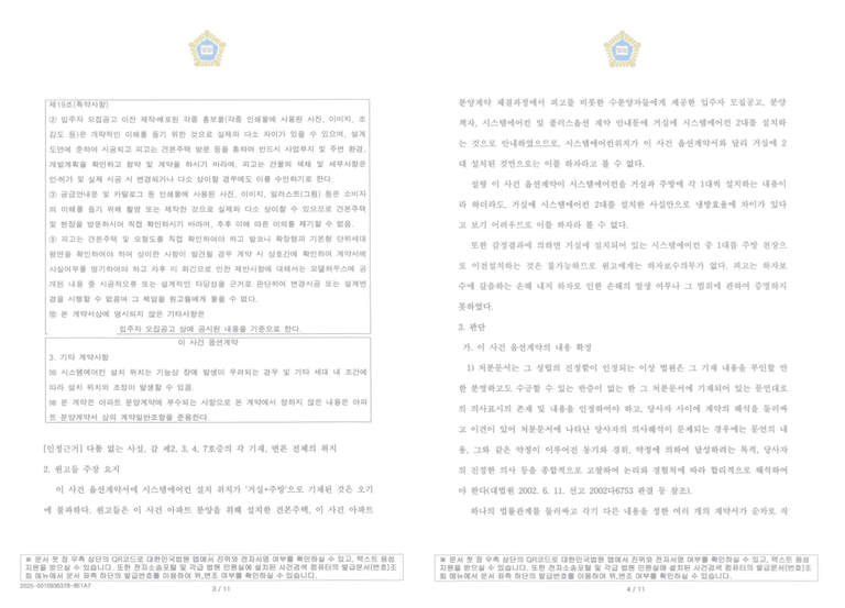 원고와 피고는 아파트 공급계약에 따라 분양계약을 체결했습니다. 이에 더해 시스템 에어컨을 옵션으로 계약한 상태였는데요, 그런데 이 옵션 계약에 관해 거실과 주방쪽 에어컨이 문제가 되어 소송에 이르게 된 것입니다.