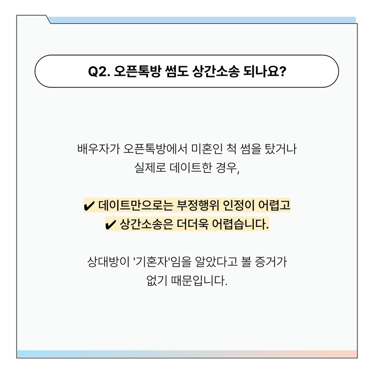 또한, 오픈톡의 특성상 상대방이 기혼자라는 걸 알았는지 입증하기 힘들어요. 그래서 상간소송까지 이어지긴 쉽지 않습니다.