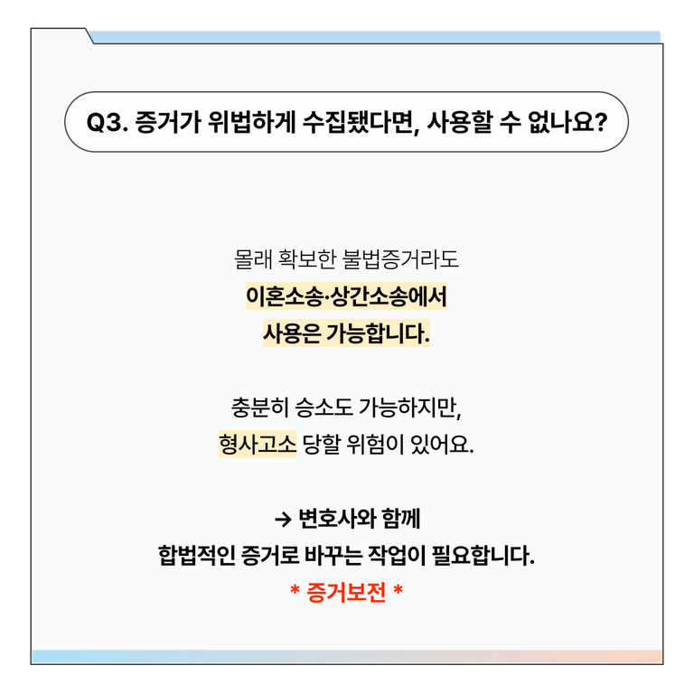 불법적으로 확보한 증거도 상간소송이나 이혼소송에서는 사용할 수 있고, 실제로 승소합니다.