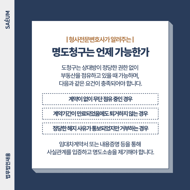 명도청구는 상대방이 정당한 권한 없이 부동산을 점유하고 있을 때 가능하며, 다음과 같은 요건이 충족되어야 합니다.