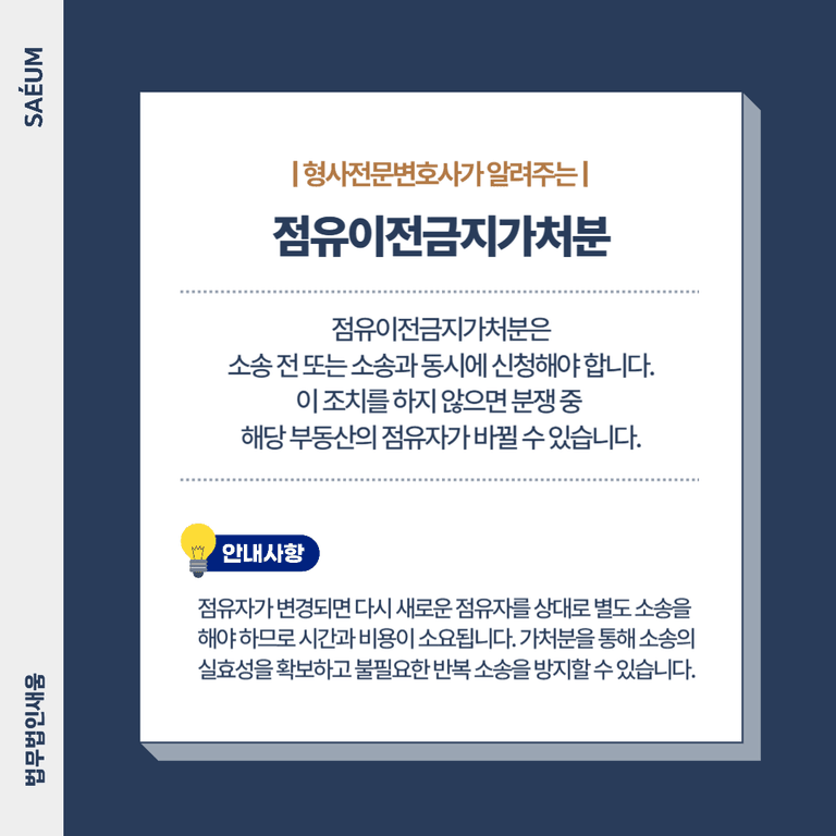 소송 전 또는 동시에 점유이전금지가처분을 신청해야 합니다. 이 조치를 하지 않으면 분쟁 중 해당 부동산의 점유자가 바뀔 수 있습니다. 점유자가 변경되면 다시 새로운 점유자를 상대로 별도의 소송을 해야 하므로 시간과 비용이 이중으로 소요됩니다. 즉, 가처분을 통해 소송의 실효성을 확보하고 불필요한 반복 소송을 방지할 수 있습니다.