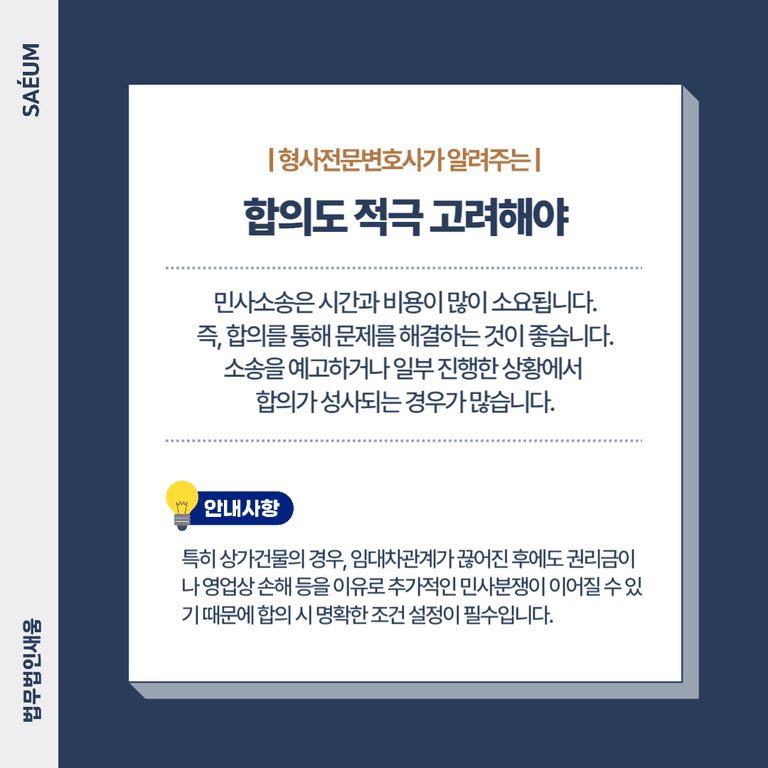 합의는 단순히 비용과 시간을 절약하는 데 그치지 않고, 장기적인 법적 리스크를 줄이는 데에도 효과적입니다. 특히 상가건물의 경우, 임대차관계가 끊어진 후에도 권리금이나 영업상 손해 등을 이유로 추가적인 민사분쟁이 이어질 수 있기 때문에 합의 시 명확한 조건 설정이 필수입니다.