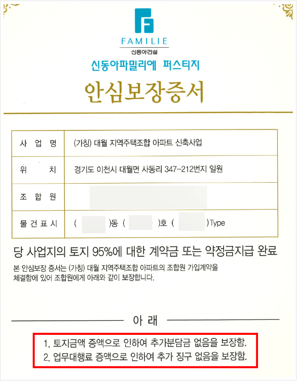 해당 조합은 계약자들에게 “토지금액 증액으로 인한 추가 분담금 없음”, “업무대행료 증액으로 인한 추가 징수 없음”이라는 내용을 포함한 확정분담금 약정서, 이른바 ‘안심보장증서’를 교부한 바 있습니다. 그러나 이 문서는 다수의 법원에서 법적 효력이 없는 무효 문서로 판단되고 있으며, 실질적으로는 계약을 유도하기 위해 제공된 사기성 문서에 해당합니다.