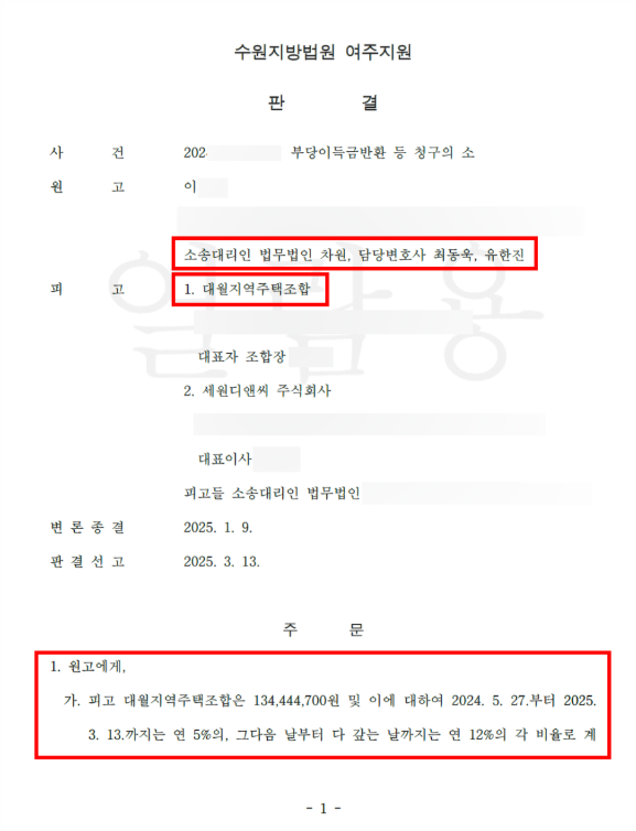 최근에는 대월 지역주택조합을 상대로 전액 승소 판결을 받은 또 다른 의뢰인분들께서, 판결금 약 3억 원을 실제로 회수하신 사례가 있었으며, 오늘은 이 사건에 대해 공유드리고자 합니다. 이 사건의 의뢰인들께서는 조합 가입 이후 발생한 브릿지 대출로 인한 채무 문제로도 큰 어려움을 겪고 계셨던 분들로, 유사한 상황에 처해 계신 분들께는 실질적인 참고가 될 수 있는 사례입니다.