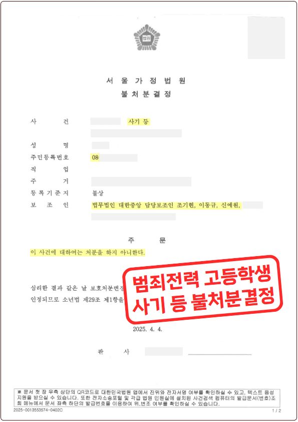 또, 부모님의 탄원서를 제출하며 부모님의 보호의지와 능력이 충분하고, 피해자들과 연락이 닿는대로 피해 회복을 위해 노력할 것임을 강력히 주장하였습니다.