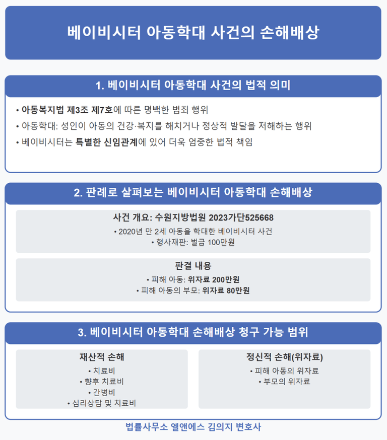 오늘은 사회적으로 큰 공분을 일으키고 있는 베이비시터 아동학대 사건의 법적 책임과 손해배상 청구 방법에 대해 전문적인 시각으로 알려드리겠습니다.