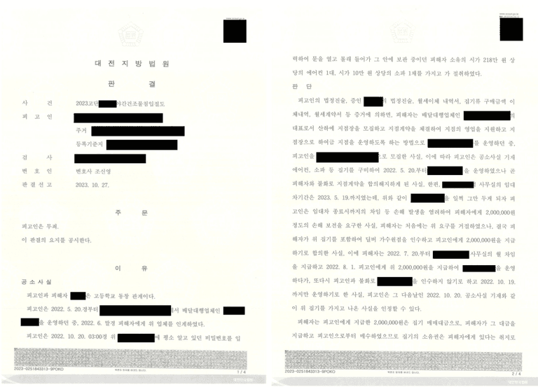 피고인이 지점장이 되고 나서 업체 운영을 위해 에어컨과 소파를 구매하였으나, 이후 둘 사이의 불화로 지점 계약을 합의 해지하게 된 것이죠. 그러나 임대차 기간이 남아있어 손해를 걱정한 피고인이 피해자에게 200만원의 손해 보전을 요구했고, 피해자는 집기를 포함해 지점을 인수하고 200만원을 지급하기로 한 것입니다.