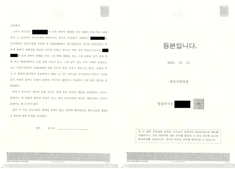 그러나 이후 또 다시 둘 사이의 불화가 발생하자 피해자가 지점을 인수하지 않기로 했고, 이에 따라 당사자 사이의 합의 사항을 지키지 못한 것이 되며 집기류 매매계약 역시 해지됐다고 평가되어야 한다고 주장하였습니다.