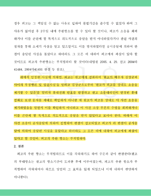 공시송달로 승소해도 끝이 아닙니다. 피고가 자신도 모르는 사이에 소송이 진행되었다며 ‘추완항소’를 제기할 수 있기 때문입니다. 이 경우 사건이 재심리되어 결과가 바뀌거나, 장기간 시간과 비용을 다시 들여야 하는 문제가 생깁니다. 따라서 추완항소 자체를 각하시켜야 합니다.