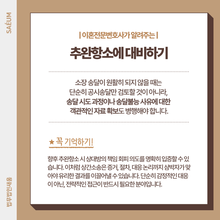 또한 소장 송달이 원활히 되지 않을 때는 단순히 공시송달만 검토할 것이 아니라, 법원 집행관의 송달 시도 과정이나 송달불능 사유에 대한 객관적인 자료 확보도 병행해야 합니다. 그래야 향후 추완항소 시 상대방의 책임 회피 의도를 명확히 입증할 수 있습니다. 이처럼 상간소송은 증거, 절차, 대응 논리까지 삼박자가 맞아야 유리한 결과를 이끌어낼 수 있습니다. 단순히 감정적인 대응이 아닌, 전략적인 접근이 반드시 필요한 분야입니다.
